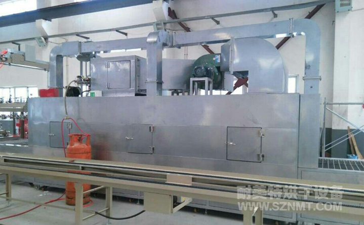 高溫氣流快速熱風(fēng)循環(huán)系統(tǒng),使工件表面快速受到熱傳遞,并將熱量均勻分配在烘干室內(nèi),升溫速度快,溫度分布均勻,采用連續(xù)不間斷的工作方式。